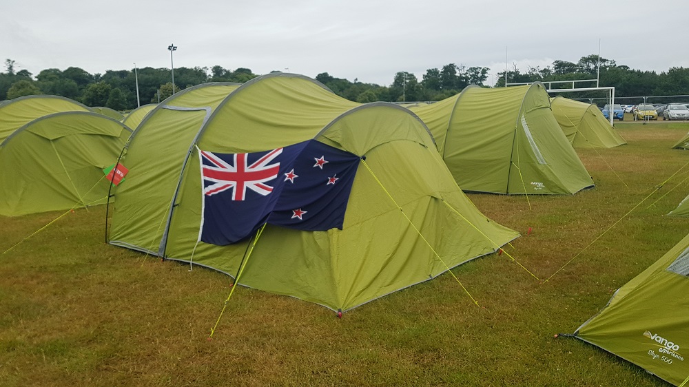 We are talking near a tent draped with a New Zealand flag. Like The Open field, the Camping Village is made up of a rainbow of nations.
