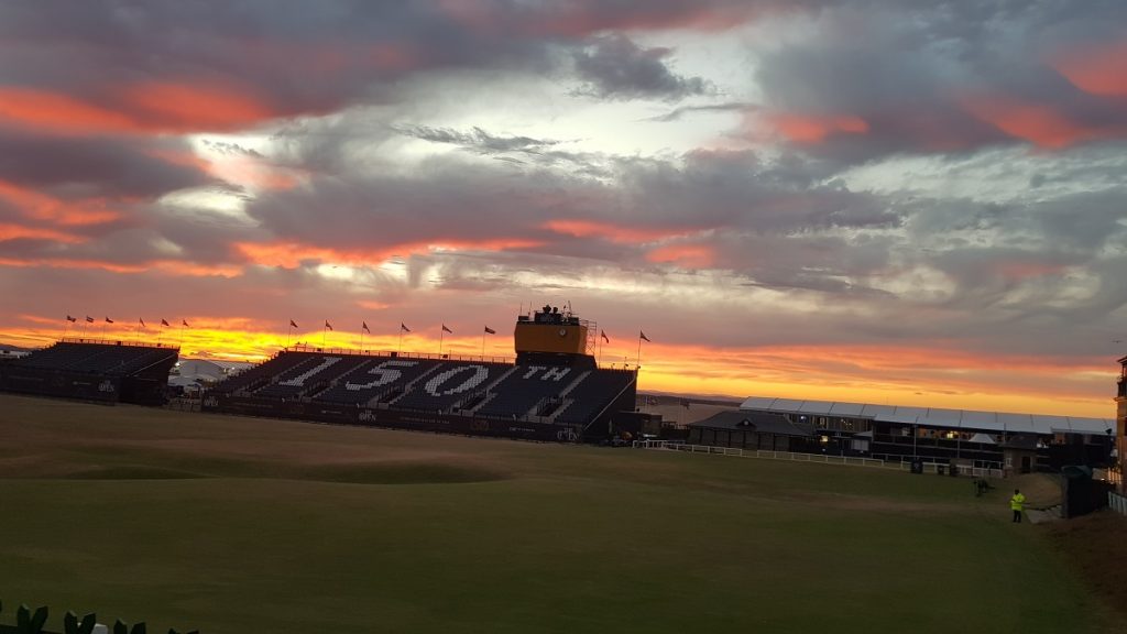 The sky above St Andrews simmers a hazy rose gold. The grandstands are empty but the flags above snap in a crisp sea breeze.